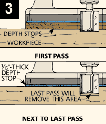 After the first pass, simply "lower" the bit during successive passes by removing one stop (Fig. 3). The final pass (after removing the laminate depth stop) will be a 1/16"-deep skim cut that will leave a clean dado at just the right depth.