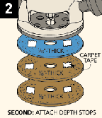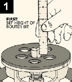 Before you add the depth stops to the base plate, the first thing to do is adjust the height of the router bit to match the finished depth of the dado, as in Fig. 1. (Once the bit is set, leave it alone.) Then carpet tape the auxiliary stops to the base of the router (Fig. 2).