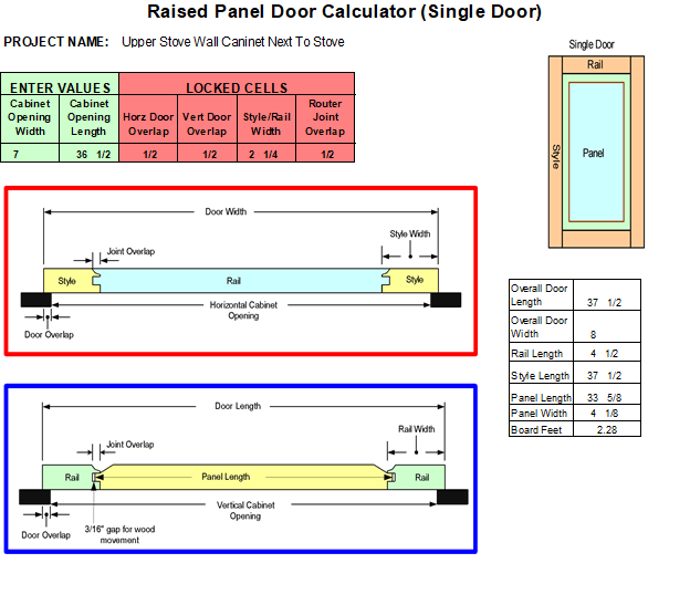 Raised Panel Door CalculatorI discovered this incredible Excel program on the web a few weeks ago while exploring www.lumberjocks.com. It is called “Jerry’s Raised Panel Door Calculator Version 2.0.” It is an Excel spreadsheet which I have modified slightly to fit the formatting of my Office 2013 program. The great thing about the program is that you do not have to be an Excel genius or even a computer genius to us it! The program allows you to generate a Microsoft Excel file that will take any size cabinet opening (remember I just said cabinet opening size) and automatically calculate the overall door size, rail and style lengths, panel size and the board feet necessary to make the door. The program allows you calculate doors for a single door, single door – double panels or double doors – single opening. Unique to the spreadsheet is the calculation of the panel inserts. The panel calculation subtracts 3/16” per side for an overall undersized panel of 3/8”. If you wonder where the 3/16” number comes in, this is the manufacturers spacing specification when you are using 0.260” Space Balls. Another thing I like about the program is that you can input the door opening in either fractions or decimals! In the spreadsheet you will note 4 locked cells and rows (colored in red) at the top of the spreadsheet. Once you input your dimensions into these four cells you will not ever have to change them unless you change your door characteristics. In the example shown below I have specified the overlay of my door, both horizontally and vertically, the width of my rails and styles and the length of the tongue on my router bit. To generate your material list all you have to do after selecting the type of door you need is to input your cabinet opening width and cabinet opening length into the green colored cells and press enter! All done. The program even provides colored drawings of your door parts and how they go together. You can also name each door and save it as a file name such as “Upper Stove Wall Cabinet Next To Stove”. The spreadsheet calculator will be placed on the web page for your access. |