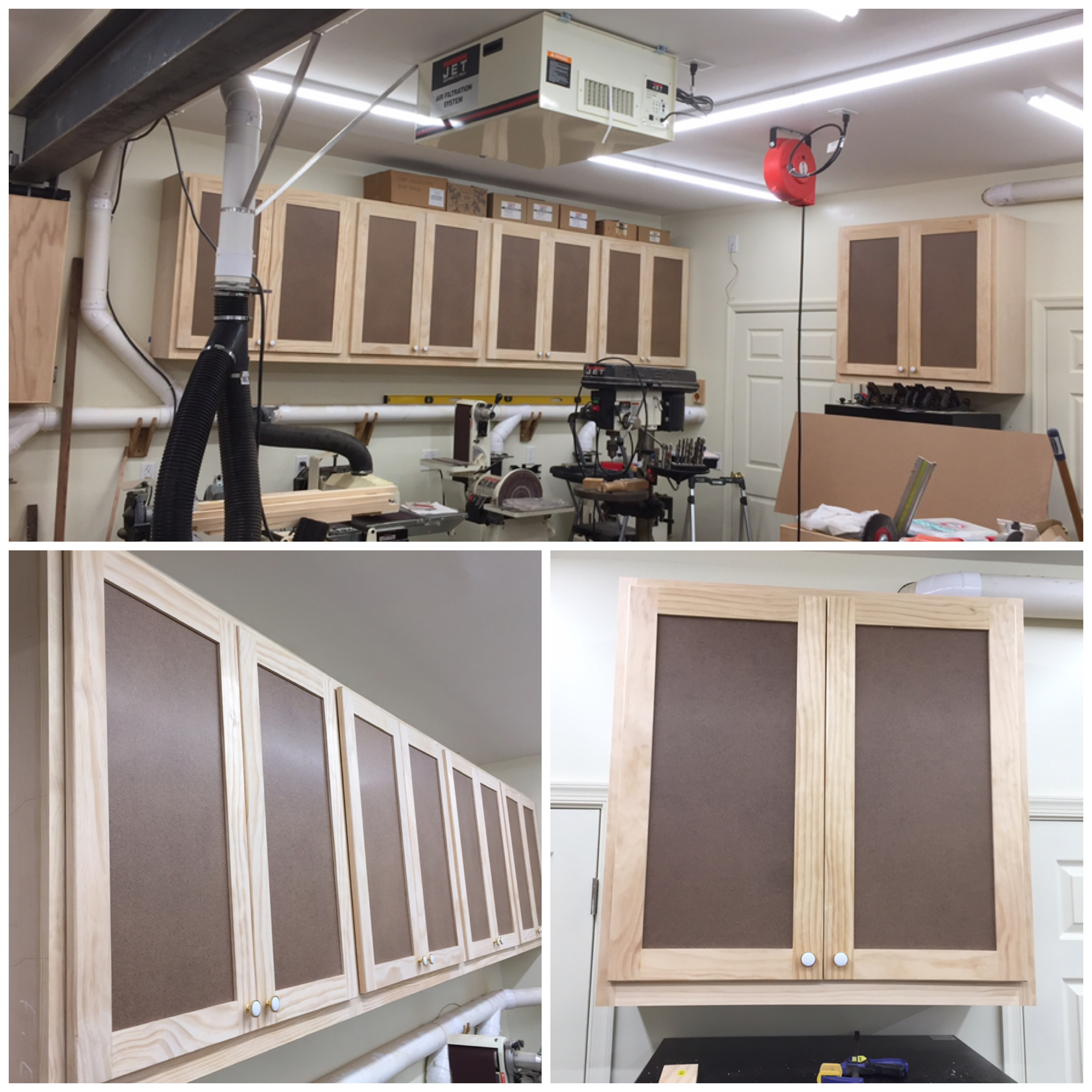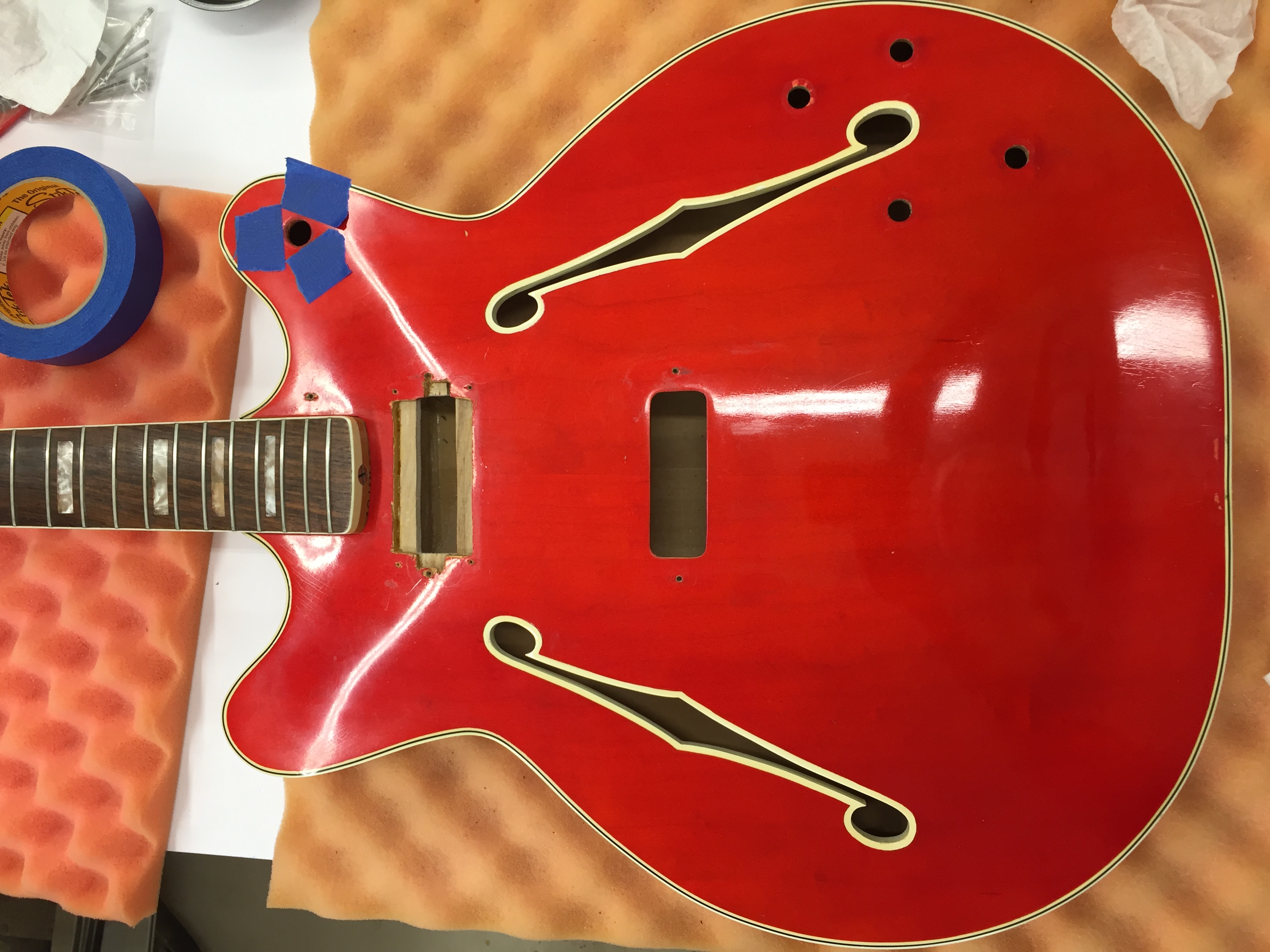 Guild member Don Newsome has also been busy in his shop with two different projects, guitar building and shop and storage cabinets. One of my woodworking goals is to scratch build guitars (both electric and acoustic). This requires special luthier tools as well as understanding the techniques and processes used to produce a quality instrument. One of my woodworking goals is to scratch build guitars (both electric and acoustic). This requires special luthier tools as well as understanding the techniques and processes used to produce a quality instrument. The final step includes the proper setup of the instrument in order to satisfy the requirements of the musician who will play it. Guitar players are a unique group of musicians and no two players seem to agree on what gage strings are best, how high or low the string action should be, and what type of frets to use. To date, I have built 3 guitars from kits (one acoustic and two electric). These kits required much hand work to complete but the experience allowed me to gain some valuable luthier knowledge and experience. The above guitars are clones of two of the most popular electric guitars ever built (the Fender Stratocaster and Telecaster). I built these for my two grandsons. Note the decals I created for the headstock which has my LumberCutter logo as well as my grandson’s names mixed in with the guitar style name (IanCaster and TeleJohn). The acoustic guitar: This acoustic guitar was a real challenge. Built during a 3 day course at the Woodcraft store. The course was intense but very satisfying and this inspired me to want to build more. This guitar mimics a Martin style acoustic with maple back and sides with a sitka spruce sound board. Along my luthier journey I’ve also accomplished repairs to a couple of guitars in order to bring them back to a playable condition. Luthiers know that repairing guitars is a valuable way to improve your instrument building skills. I also have a background in electronics, this has been very helpful in also troubleshooting problems with electric guitar circuitry. Recently I had the opportunity to repair a 1966 Fender Coronado II Hollow Body acoustic/electric guitar. A guitar that is 56 years old. It was not a playable instrument because it had multiple issues both mechanically and electrically. Several years ago someone had decided that it would be a great idea to replace the original neck pickup with one from a Gibson brand guitar. In doing so, they took a saw to the body cavity at the neck to accept the wider Gibson pickup. The modification devalued this vintage guitar. The bridge was also rusted and one of the tuners was broken. Adding to the problem, the volume and tone controls were not responding properly when plugged into an amplifier. Getting to the electronics is tough on this type of body style so before I decided to go through the effort to take it apart, I wanted to inspect all the wiring connections first. This required a peek inside the body. In my tool box of goodies is a bore scope which allows me to peek inside some really tight spaces. It has a camera with a dimmer controlled light and it connects to my iPhone so I can see what it sees and I can also take pictures. In peeking around inside the body cavity I discovered a broken ground wire on the sleeve of the input jack. The ground wire from the large gray wire is suppose to be soldered to the input jack. It had broken off due to a very sloppy solder job as the picture shows. I decided the only proper action for this guitar was to try and bring it back to its original 1966 glory by using genuine vintage parts. Fortunately I was able to snag several used 1966 Coronado parts from eBay; however, finding an original Fender neck pickup was not so easy but after several months someone finally posted one for bid and I scored. The bridge and tuner were easy to replace but mounting the neck pickup was a problem due to the body modification that had been accomplished. Here is the body after removing the pickups, controls, selector switch, and wiring harness. Note the butchered body at the neck. While I had it apart, I decided to clean and polish the body. I was amazed at how well the finish survived after all these years. After replacing parts and soldering the ground connection, it was time to test the electronics. The pickups and controls worked as designed. Success! After minor adjustments to the neck it was time to setup the guitar. Here are some pictures of the completed work: The best part is that the customer who owns this guitar is very grateful that it’s now a player and it’s value has been restored. Since I also play guitar, my next guitar will be a scratch built Fender Telecaster built to my specifications.