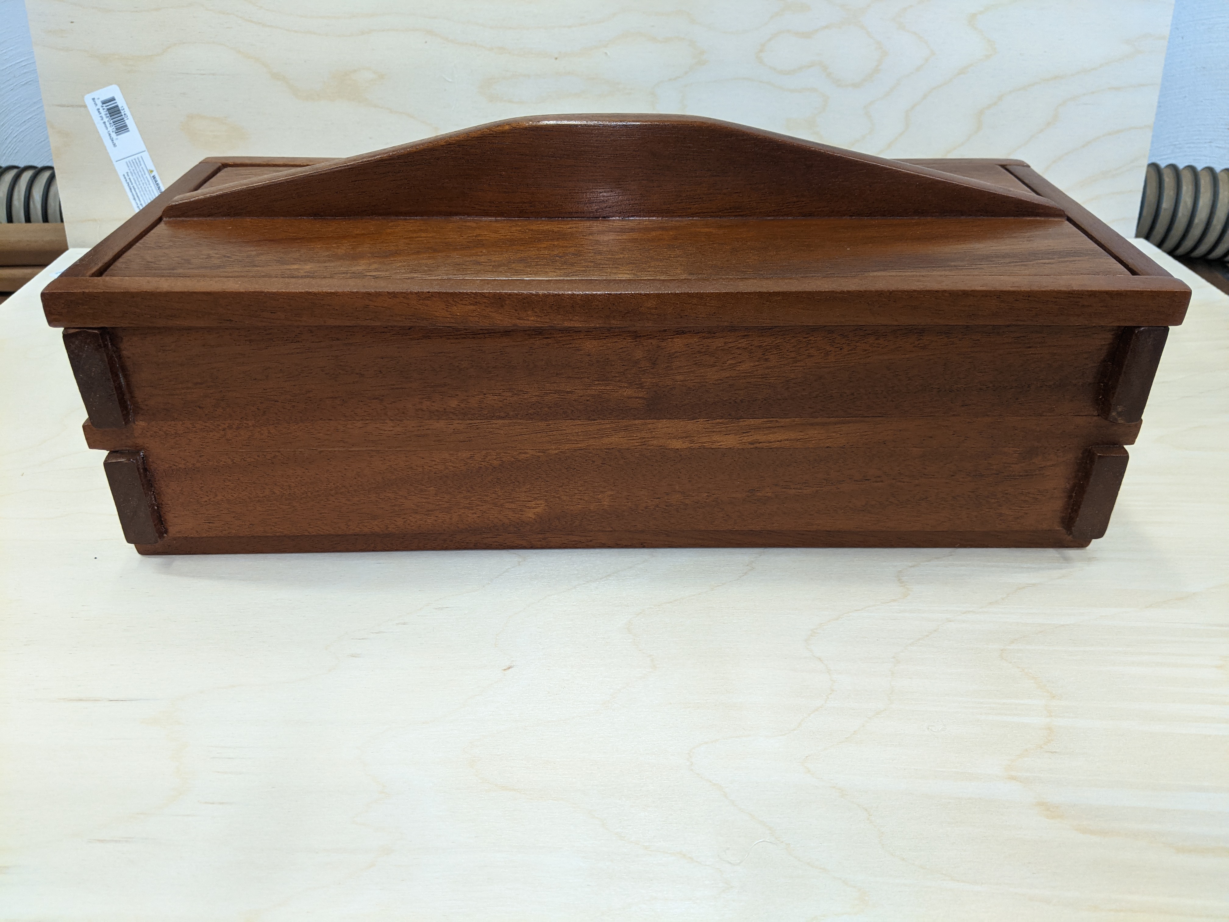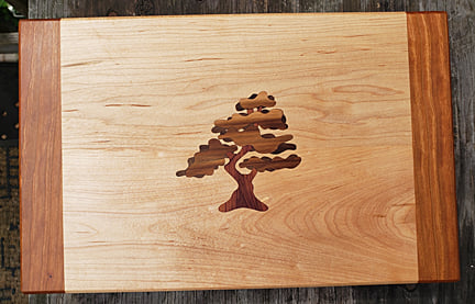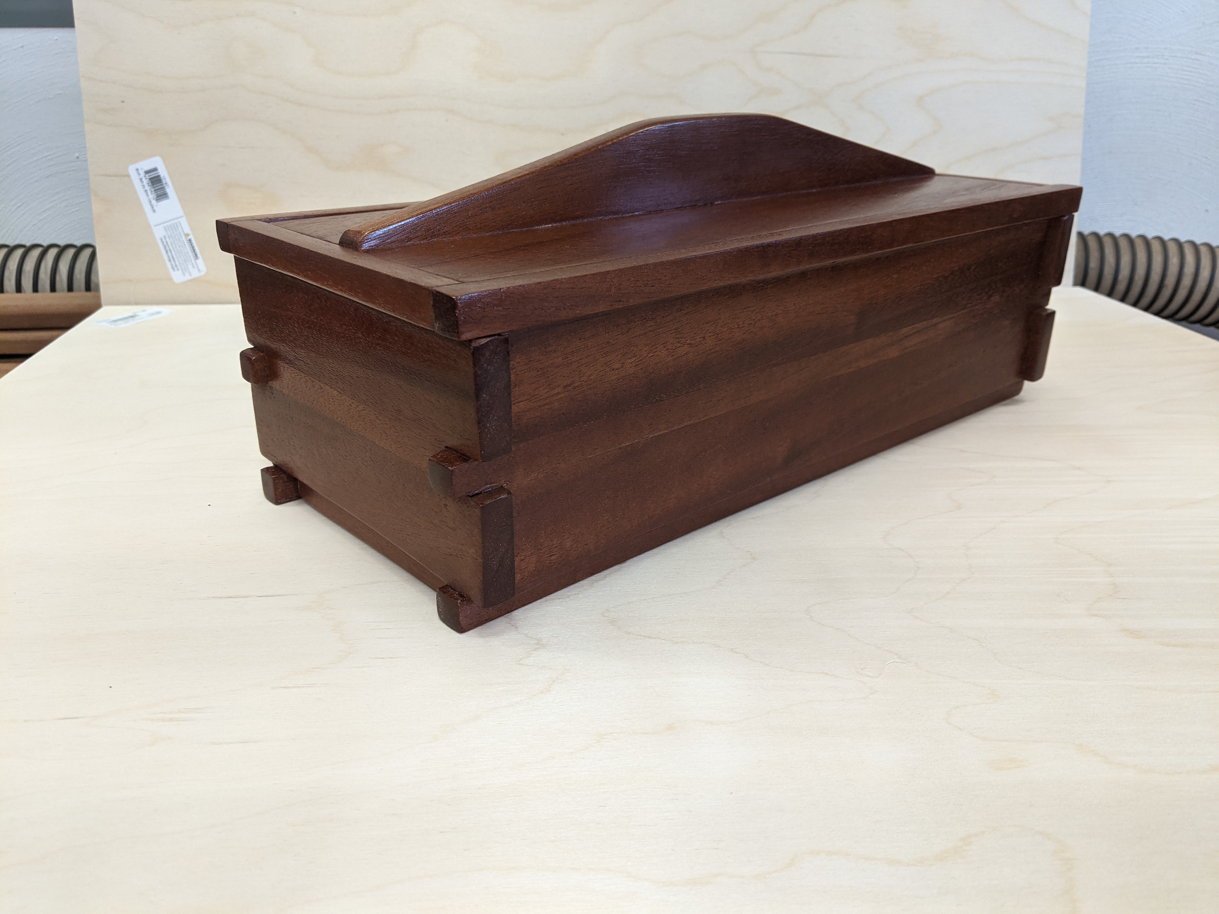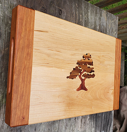 Guild Woodworking ProjectsOur first project comes from Karl Bogot. Project 8 for 2021 is a multiple process cutting board. The Bonsai design is made up of 15 individual pieces of wood. The board itself is maple with sapele breadboard ends. The board measures 19" x 12" x 1 3/4". The inlays are cut from aromatic cedar, cherry and sycamore. The next project comes from Chris Zuchristian. This was a gift for the host and hostess. It is made from Mahogany and finished with lacquer. The design is an adaptation of the gift box challenge a few years ago. The best part of the project!