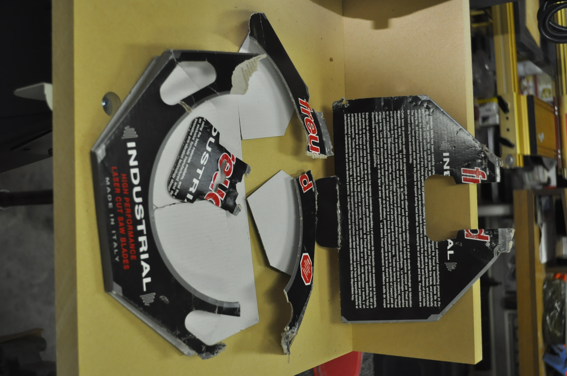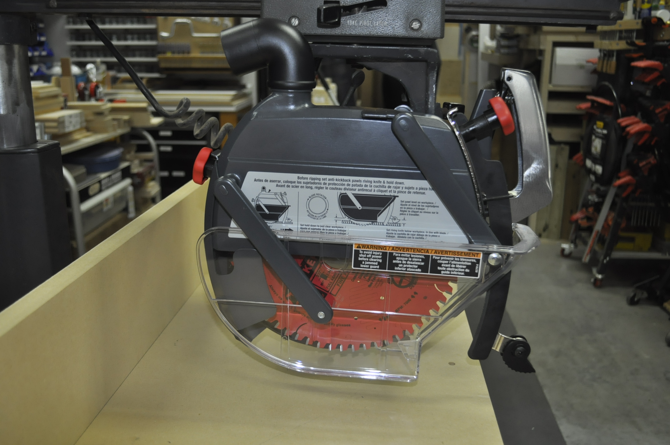 Craftsman Radial Arm Saw Photos After Restoration Craftsman Radial Arm Saw Photos After Restoration One of the big complaints about radial arm saws was that they were dangerous, particularly because of saw blade technology and the way the saw cuts. They had a tendency to grab the wood and actually climb over the piece of wood that was being cut. Very scary. During the upgrade process I replaced the saw blade that was on the radial arm saw with a newer more modern design designed for sliding compound saws and radial arm saws. I chose a Freud 60 tooth10” saw blade with alternate tooth bevel grind and a negative 5 degree hook angle. This 5 degree negative hook angle helps prevent the blade from being too aggressive and pushes the work piece down and towards the fence. It is a thin kerf blade and removes less material that standard thick kerf carbide blades. One of the scariest thing about this blade happened a few days ago. This is an expensive blade running about $85. It was a special order from Woodcraft sometime back and I had it sitting on our kitchen island top and though nothing about getting it out to the shop until I was ready for its installation. Anyway, a few day ago I took my wife to the laser vision center for her cataract surgery consultation. Because they dilated her eyes I drove her over to the center and then went back home. I was only gone about 20 minute’s total. When I got home I found our face masks that we hang on the refrigerator all over the floor, papers and a notebook that were on the island were now on the floor and the remains of the box and packing material of the new, never opened Freud saw blade all over the kitchen floor and family room! All I could think was that Smokey, the Boxer dog had just ruined an $85 dollar saw blade. I finally found the saw blade in the family room and even though it had fallen about 40 inches from the island counter top onto the ceramic tile floor it looked undamaged. I think the box the saw blade came in took the brunt of the fall. Saw Blade Package After Smokey The Boxer Ate It! Another thing I like about the upgrade package to the blade guard is the new dust port. If you look at the pictures below you can see that the dust port on the old blade guard came out right in front of the blade and in your face! The new blade guard dust port takes the dust out the back and away from your face.
