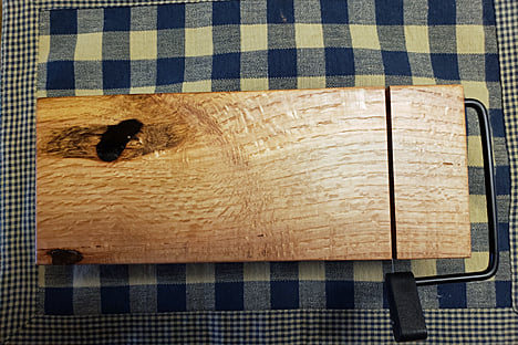 Project 17 for the year is a natural edge spalted oak charcuterie board. This one has a name: Wormwood. The 16 x 8 x 1 board is made from scrap left over from the milling of a large branch. It is pocked with boring holes from insects, each reamed and cleaned before being filled with clear resin/epoxy and then soaked in mineral oil and polished with beeswax/oil 'board butter. This would be an eye-catching addition to the kitchen of anyone who appreciates the endless beauty of wood. Project 18. This is a 12 x 5 x 3/4" cheese slicer made from a twisted scrap of quarter-sawn red oak. It had a number of large intrusions that I filled with resin/epoxy and polished to a transparent view.