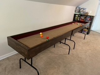 The Carpetball Table was made for one of the families. This is a Midwest game in which you try to knock the opponent’s pool balls into the pocket at the opposite end. The table is 12’ long and 2’ wide with carpet on the base and sides. It is made in two 6’ sections for easy transporting. I made this as a Christmas present and you can imagine how difficult it was to what's this guy! A funny’s sport and anyone that is interested can find more information and plans at carpetball.org.