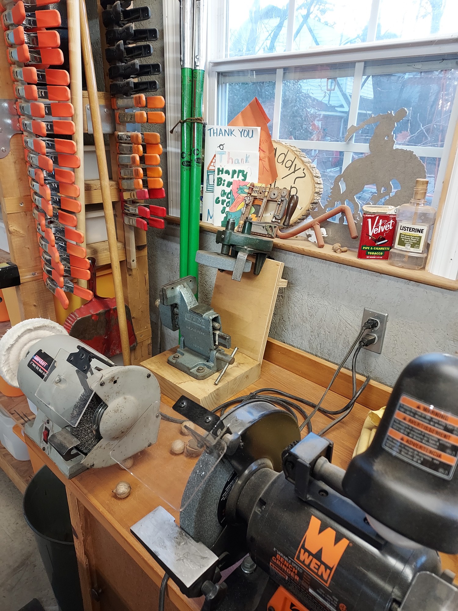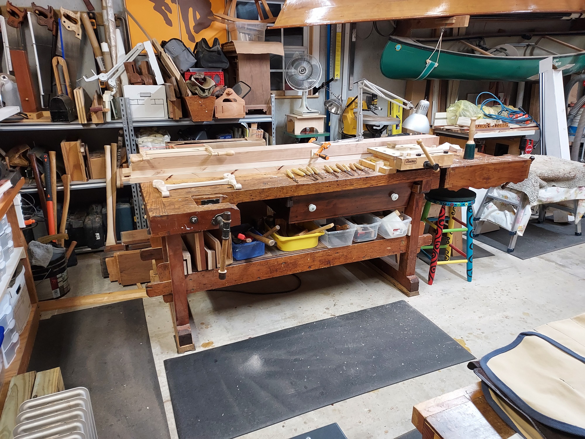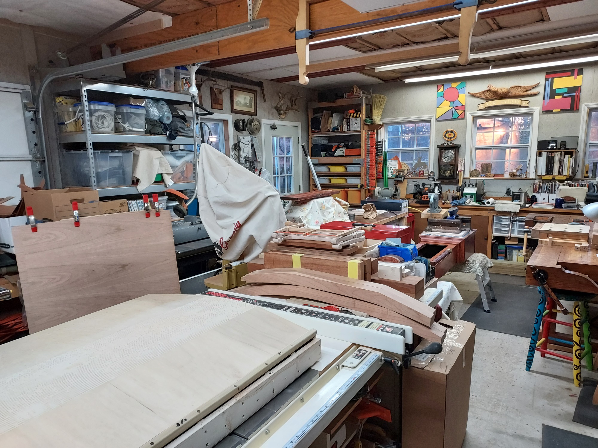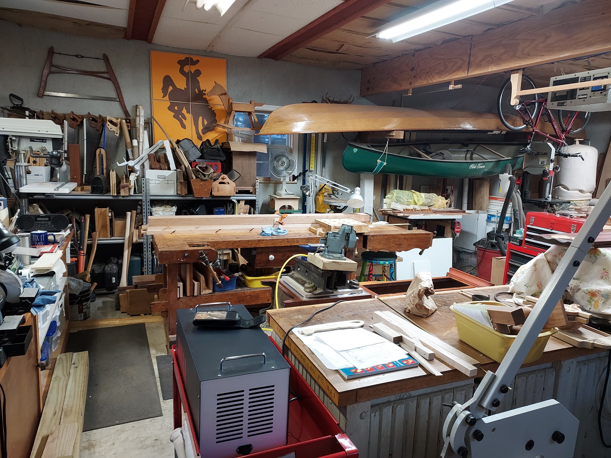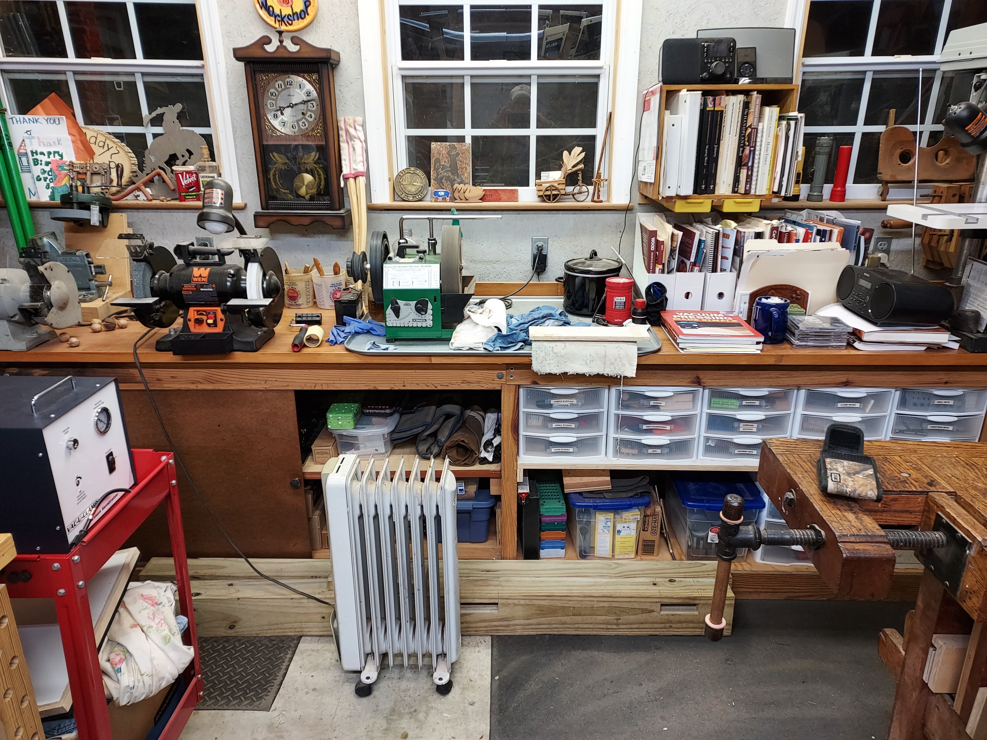 • Lots of windows (5), plus a windowed door. No more windowless office work! • Dehumidifier and small electric heater provide climate control. • Lighting: Overhead LED with local light at the workbench Arrangement practices • Just like a kitchen; everything is just a couple steps away from where it's used • Most tools in drawers, on shelves in boxes, and in cabinets to make cleanup easier.