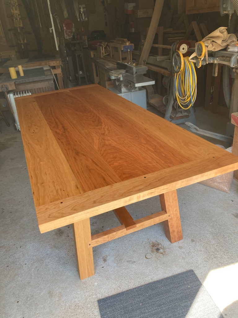 3 Toilet Bowl Wand Bathroom Holders For Their New House Our last project comes from Chris Haycox. A fellow woodworker and good friend, Scott, asked me if I would be interested in making a table for one of his friends, Wick. I made contact with Wick who happens to be friends with Greg Horvath. Wick and I met Greg's place to select wood for the table. The table is made from curly Cherry and measures 40" wide by 8 foot long and the top is 1 1/2" thick. Wick gave me a basic idea of what he and his wife were looking for and I went from there. Their requirement was for clean lines. I designed exposed dovetails between the legs and the stretcher between the leg assemblies for both aesthetics and mechanical strength. The table was finished with 6 coats of natural Danish oil and 2 coats of Butchers Bowling Alley Wax. The table weighs in at a whopping 130 pounds! Chris's Curley Cheery Table The flag box- So after 30+ years, my wife and I finally bit the bullet and wrote a contract with Dave's Concrete to have our driveway replaced. Dave came highly recommended and we signed the contract last fall knowing that he wouldn't be getting to us until this spring. Well, at the end of April Dave and crew replaced the driveway. If anyone in the guild needs concrete work done, I highly recommend him. Now back to the flag box. I had mentioned to Dave that I had finished a Cherry table and he was interested in seeing it. While in my shop, Dave noticed some Cherry flag boxes that I had lined up on a stack of lumber and asked me if I could make one for his daughter's retirement flag. The only requirement was that it be made out of Mahogany. The flag box was made from a piece of Cuban mahogany that came from my great great uncle's shop (around 1930). The laser engraving was done by a friend of mine. I did contract work for him building flag boxes and shadow boxes between 2002 and 2010. The finish is 3 coats of natural Danish oil, 3 coats of Deft semi-gloss lacquer, and 2 coats of Butchers Bowling Alley Wax applied prior to the laser work. Mahogany Flag Case & Laser Engraving |