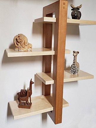 Guild ProjectsOur First project comes from Karl Bogot. Project 2 for this year, and yes, I'm behind. This is a 'floating shelf'. The shelves are adjustable as to their placement. It is Cherry and Maple, measuring 24" tall. The shelves are 12" x 6". I've designed it to be very versatile. I can build it with 2 to 6 shelves, depending upon the size of the bracket.