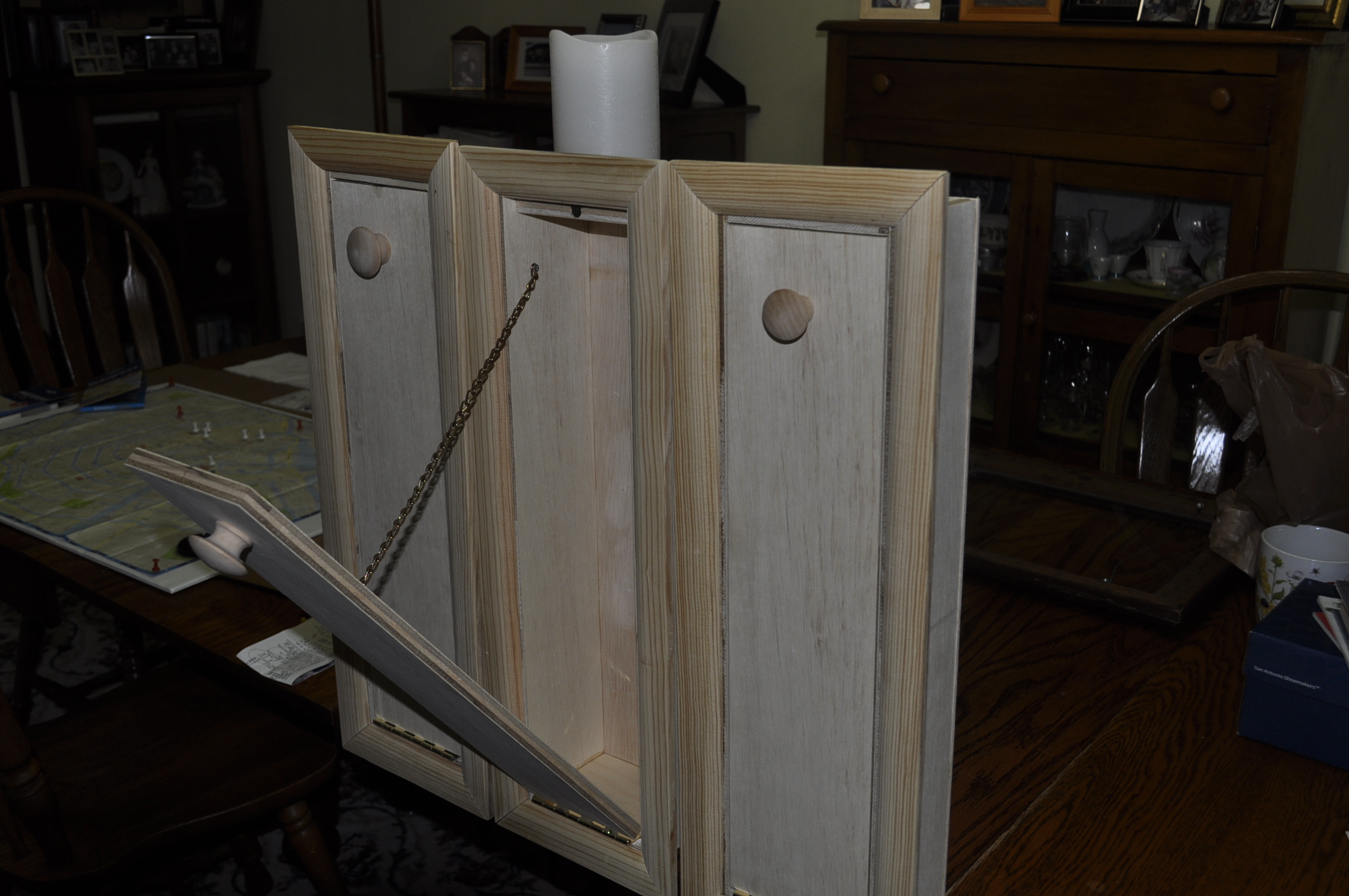 Our next project comes from Gary Stephens. My most unusual request to build something! A friend of ours are moving to a new home and she wanted me to build toilet bowl wand holder boxes to hide the toilet bowl wand. Since I am sure you are not familiar with toilet bowl wand cleaners here is your education. When cleaning the toilet bowl out you use a wand with a disposable cleaning cartridge to wipe the toilet bowl clean. When you are finished cleaning the toilet bowl you throw the cartridge away and store the wand in the box. The box is designed to be mounted in the hollow cavity of the bathroom wall between the sheet rock on either side of the bathroom wall. You open up the box by pulling on the handle and the face pulls out exposing the cleaning bowl wand and the new cleaning cartridge. The boxes were made out of scrap wood and the frame is nothing more than screen stop.